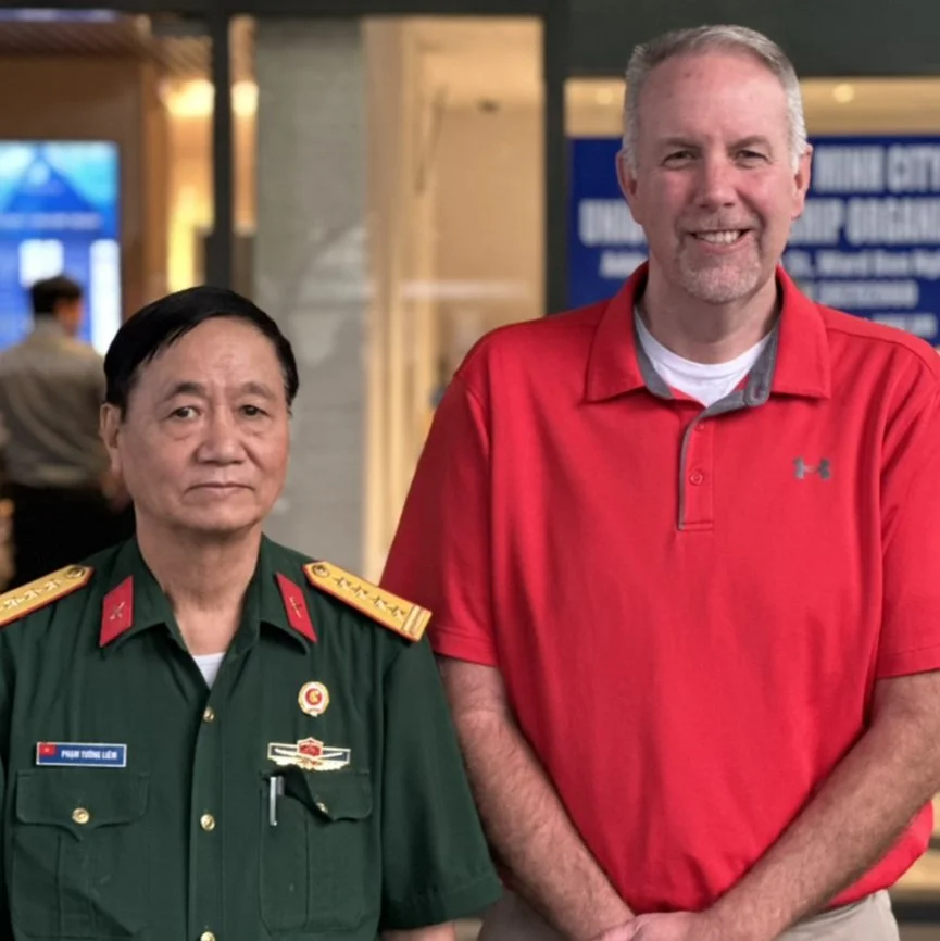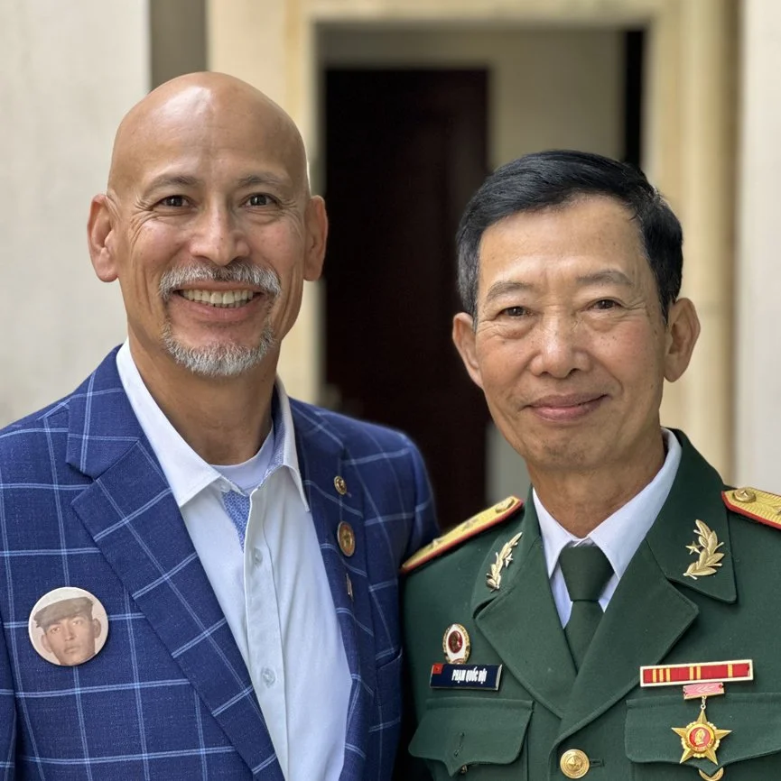 Doug Godfrey, the son of Air Force Captain Johnny Godfrey, stands with the decorated Vietnamese pilot Nguyen Hong My. Doug read about My before going to Vietnam and was impressed with his extraordinary story both during and after the war. My was shot down by F-4D Phantom pilot Major E. Daniel Cherry and survived. Decades later, the two men met in Vietnam. They became good friends who were able to put the war behind them. Doug read something My said that stuck with him: the Vietnamese, My siad, are a peace loving people. Doug was able to meet with My and connect over a peace-focused