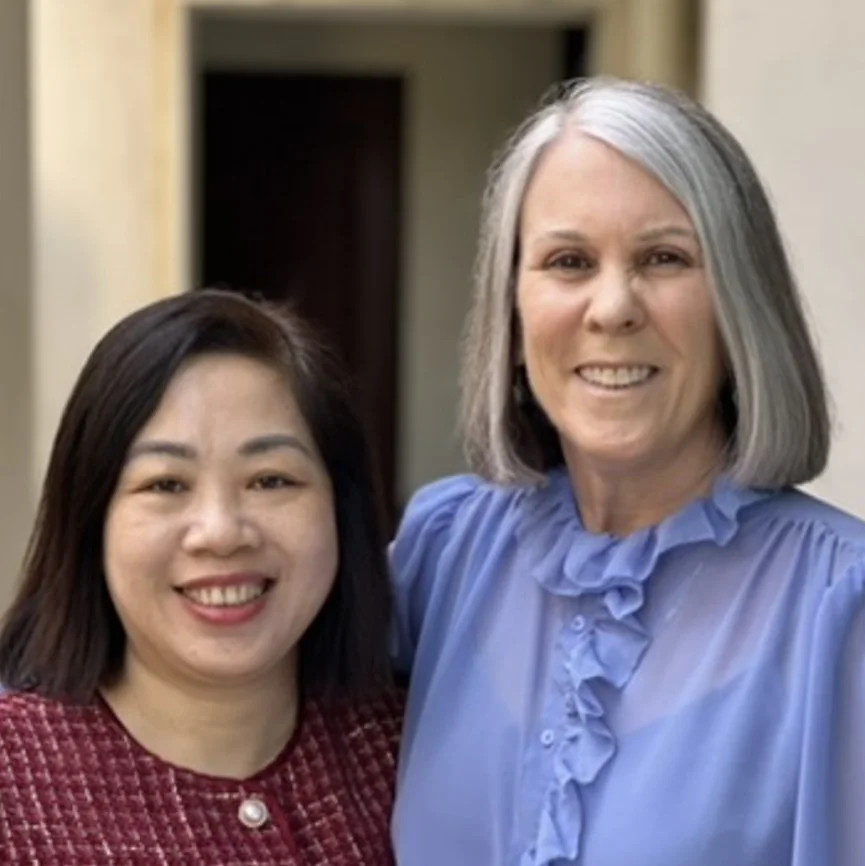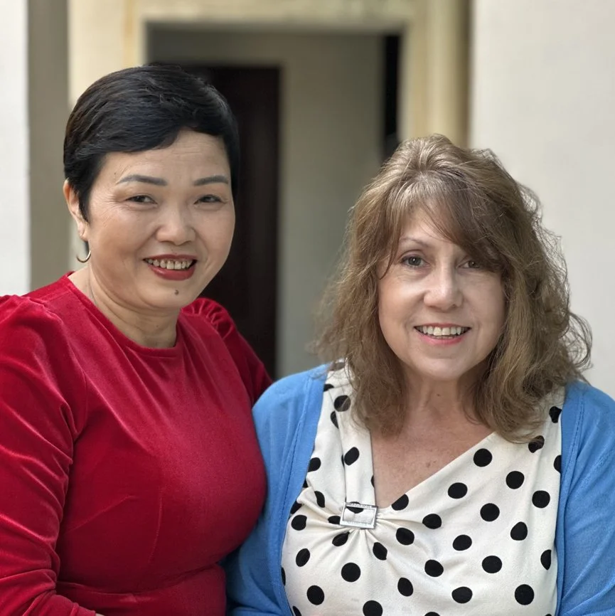 Mike and Dina with Thuy and Trung. Mike and Dina met in high school in Arizona. Thuy and Trung met in their high school in Saigon. The couples have been married ever since. They met at the 2 Sides Project meeting in Saigon, January 2024.